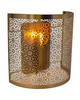 Die Wandleuchte „Hermine“ besteht aus mattem, goldfarbenen Metall. Das Leuchtmittel befindet sich an der Wandhalterung und wird von dem blumenähnlich gemusterten Schirm umhüllt. Die goldene Farbe der Leuchte verleiht ihr eine warme, einladende Wirkung und zusammen mit dem schönen Muster erzeugt die eingeschaltete Leuchte den Eindruck eines schönen offenen Feuers.
